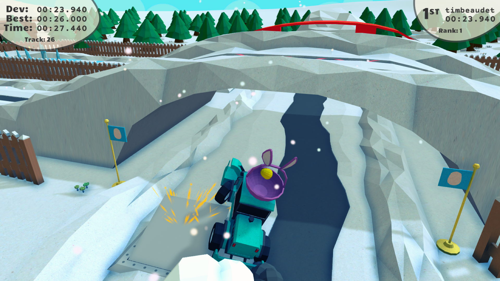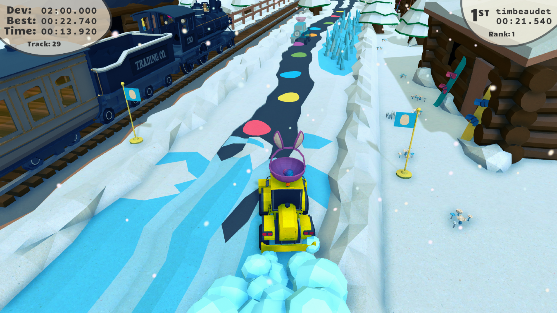 Deliver Easter eggs around the North Pole, drifting and sliding through snow banks without dropping an egg. A new set of time-trial challenges snowman can do.